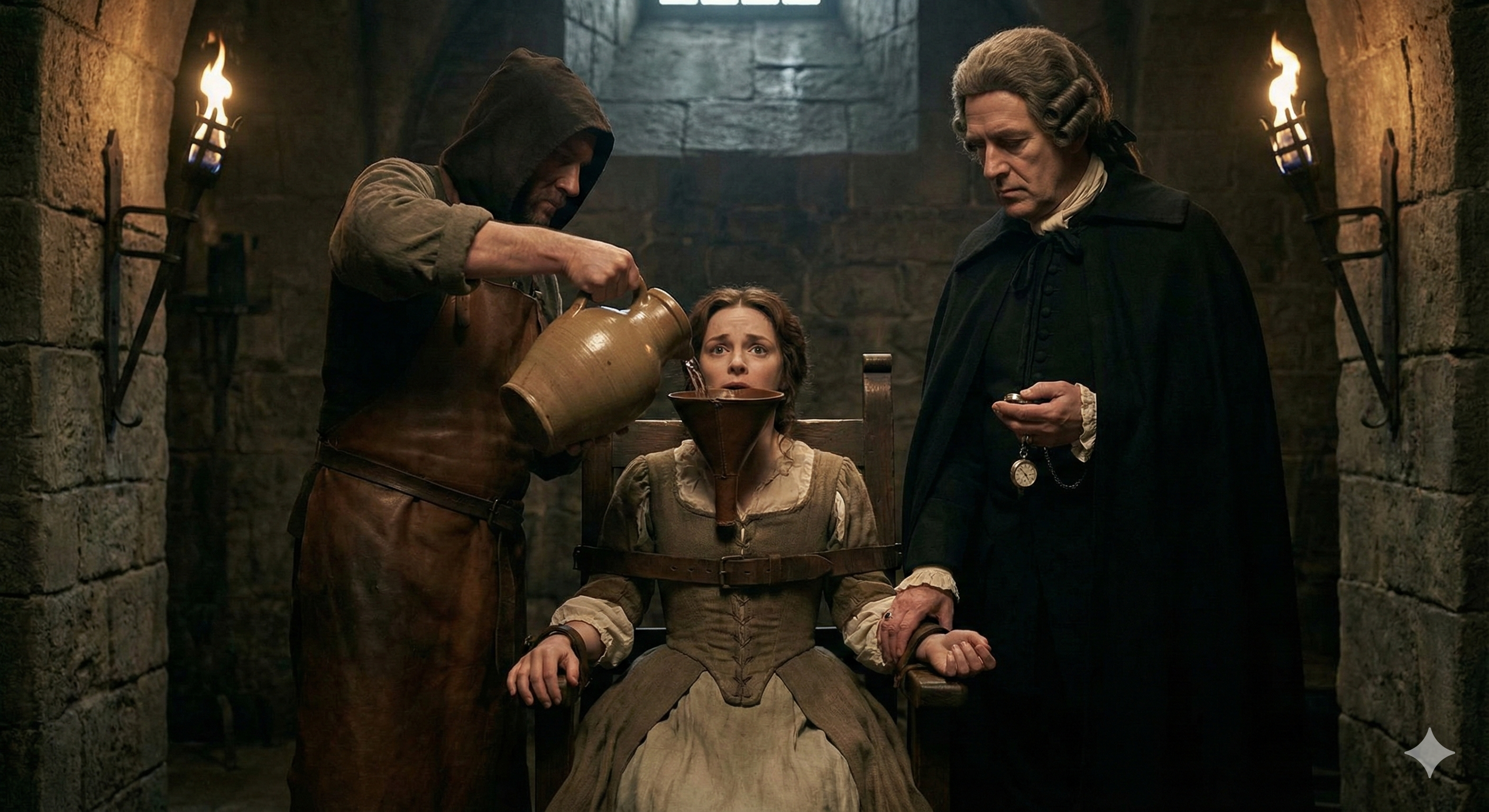 Marquise De Brinvilliers'in İtiraflarını Elde Etmek Amacıyla Uygulanan "Su İşkencesi" Yöntemi Ve Sorgu Anı (Yapay Zeka İle Oluşturulmuştur)