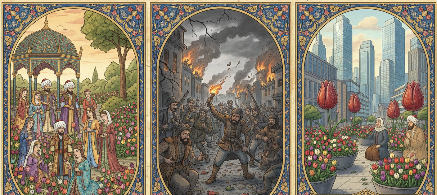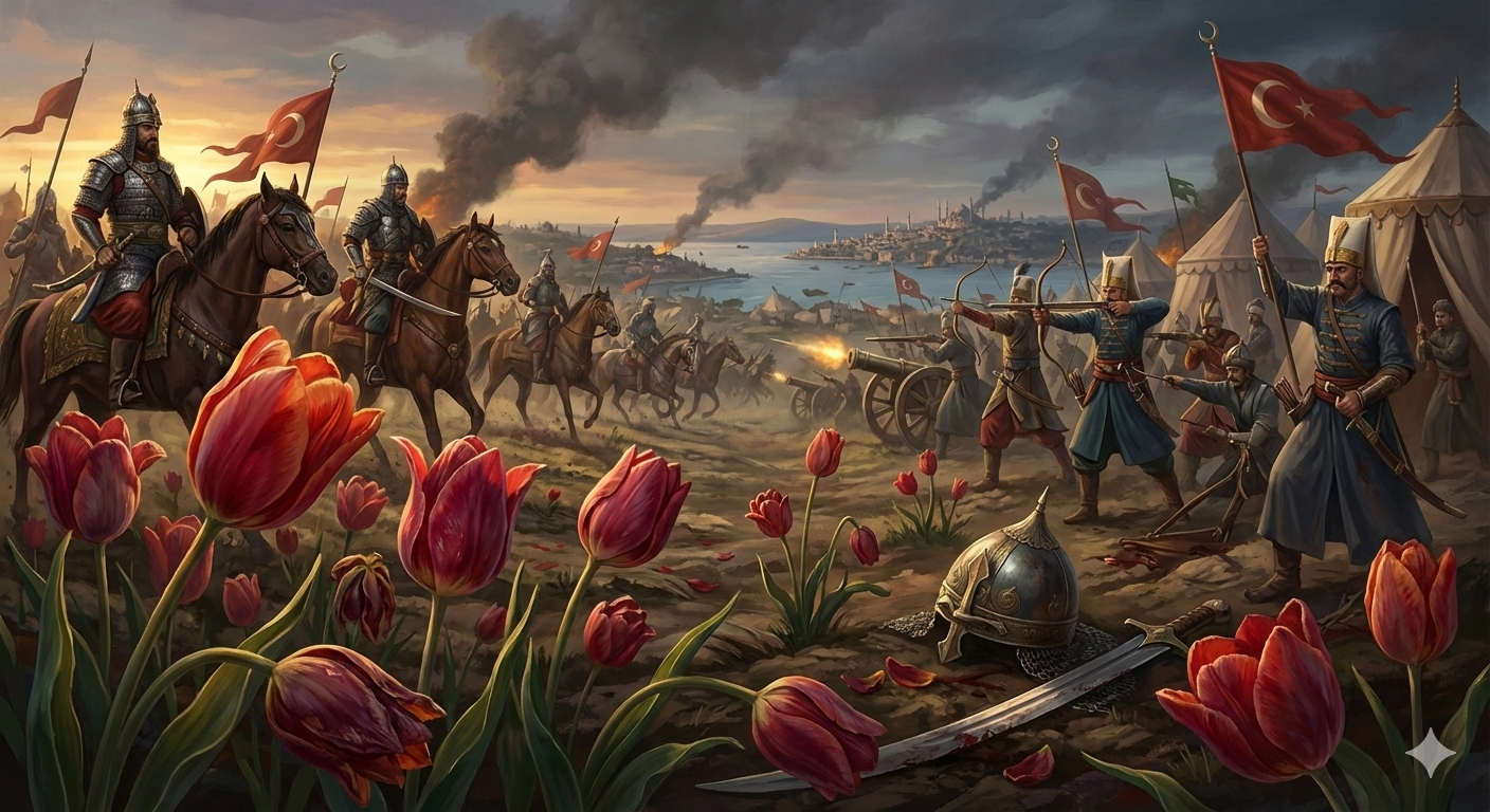 Osmanlı Tarihinin Fırtınalı Dönemlerini ve Lâlenin Bu Zorlu Süreçlerdeki Sembolik Duruşunu Tasvir Eden Bir Görsel (Yapay Zeka ile Oluşturulmuştur)