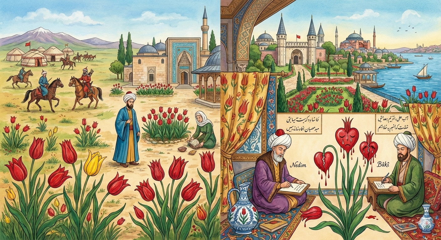 Orta Asya bozkırlarında yabani bir çiçek olarak varlık bulan lale, Türklerle birlikte uzun bir yolculuğa çıkmış; Selçuklu’dan Osmanlı’ya uzanan bu serüvende giderek bir estetik idealin, bir medeniyet zevkinin taşıyıcısı hâline gelmiştir. Anadolu’da XII. yüzyıldan itibaren süs bitkisi olarak yetiştirilmeye başlanan lale, özellikle İstanbul’da, doğayla kurulan ilişkinin en rafine ifadesine dönüşmüştür. Öyle ki Osmanlı insanı için lale yalnızca güzel olduğu için sevilmemiştir; şekliyle, rengiyle ve çağrışımlarıyla bu çiçeğe derin anlamlar yüklenmiştir. Örneğin Divan şiirinde lale, gül kadar ihtişamlı, bülbül kadar dertli ama hepsinden farklı olarak biraz mahcup, biraz yalnız bir çiçek olarak resmedilir. Ahmed Paşa’dan Bâkî’ye【1】 , Nedîm’den Necâtî’ye kadar pek çok şair, laleyi kimi zaman baharın müjdecisi, kimi zaman yara unsuru olarak işlemiştir.【2】
