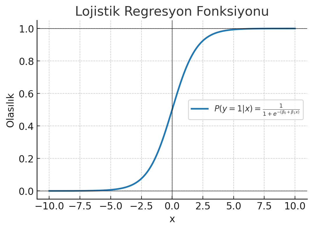 Lojistik regresyon, doğrusal regresyondan farklı olarak bağımlı değişkenin sürekli değerlerini değil, belirli sınıflara ait olma olasılıklarını hesaplar. Matematiksel olarak model, sigmoid (S-eğrisi) fonksiyonuna dayanır. Bu fonksiyon sayesinde tahmin edilen değerler 0 ile 1 arasında sınırlandırılır.