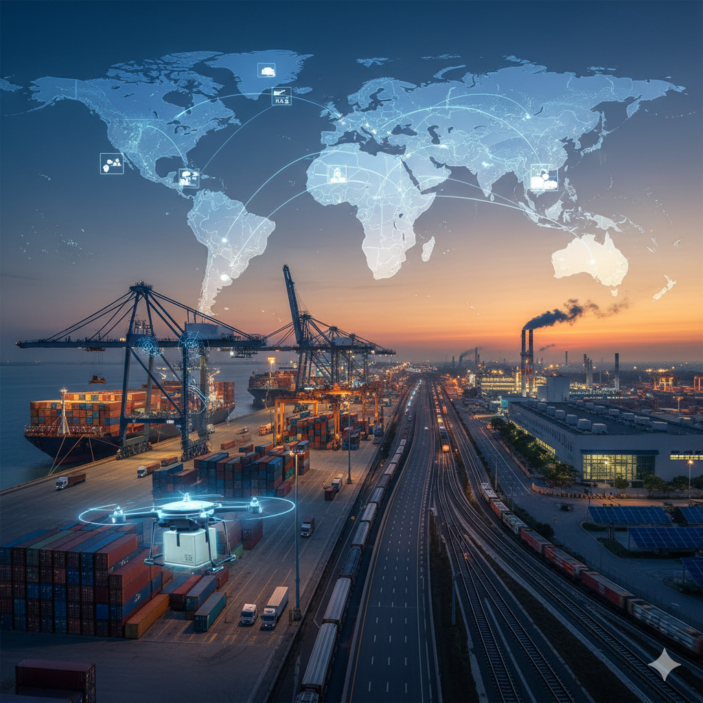 Görselde, Hammadde Tedarikinden Nihai Tüketiciye Kadar Akışı Sağlayan Kara, Hava ve Deniz Ulaşım Modlarının Bütünsel Yönetimi Yansıtılmaktadır. (Yapay Zeka ile Oluşturulmuştur.)