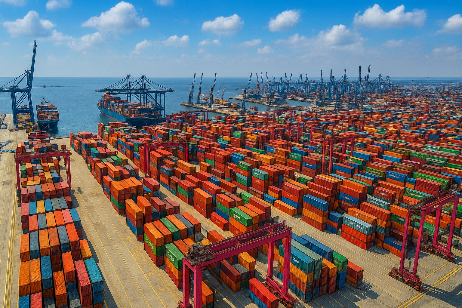 Görsel, Uluslararası Ticaretin ve Küresel Zincir Görünürlüğünün Temelini Oluşturan Büyük Ölçekli Liman ve Kargo Operasyonlarını Göstermektedir. (Yapay Zeka ile Oluşturulmuştur.)