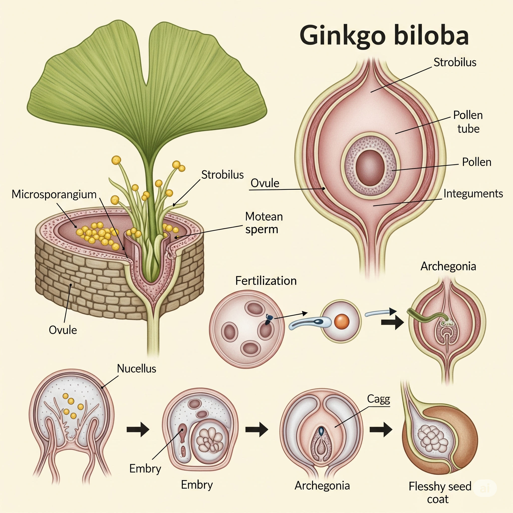 Dioik yaşam formunda erkek bireyler mikrosporangiyum yığınlarından oluşan sarkık strobiluslar, dişi bireyler ise ilk bakışta tekil ovüller taşıyan kısaltılmış dik duruşlu aksesuvar yapılar üretir. Çifte gübrelenme bulunmayıp, serbest yüzme yeteneğine sahip çok kirpikli spermler arkaik bir üreme stratejisi sunar. Tohumlar etli sarı sarcotesta, odunsu sclerotesta ve ince endotesta katmanları içerir; embriyo tohum olgunluğunda çoğunlukla dormant kalır.