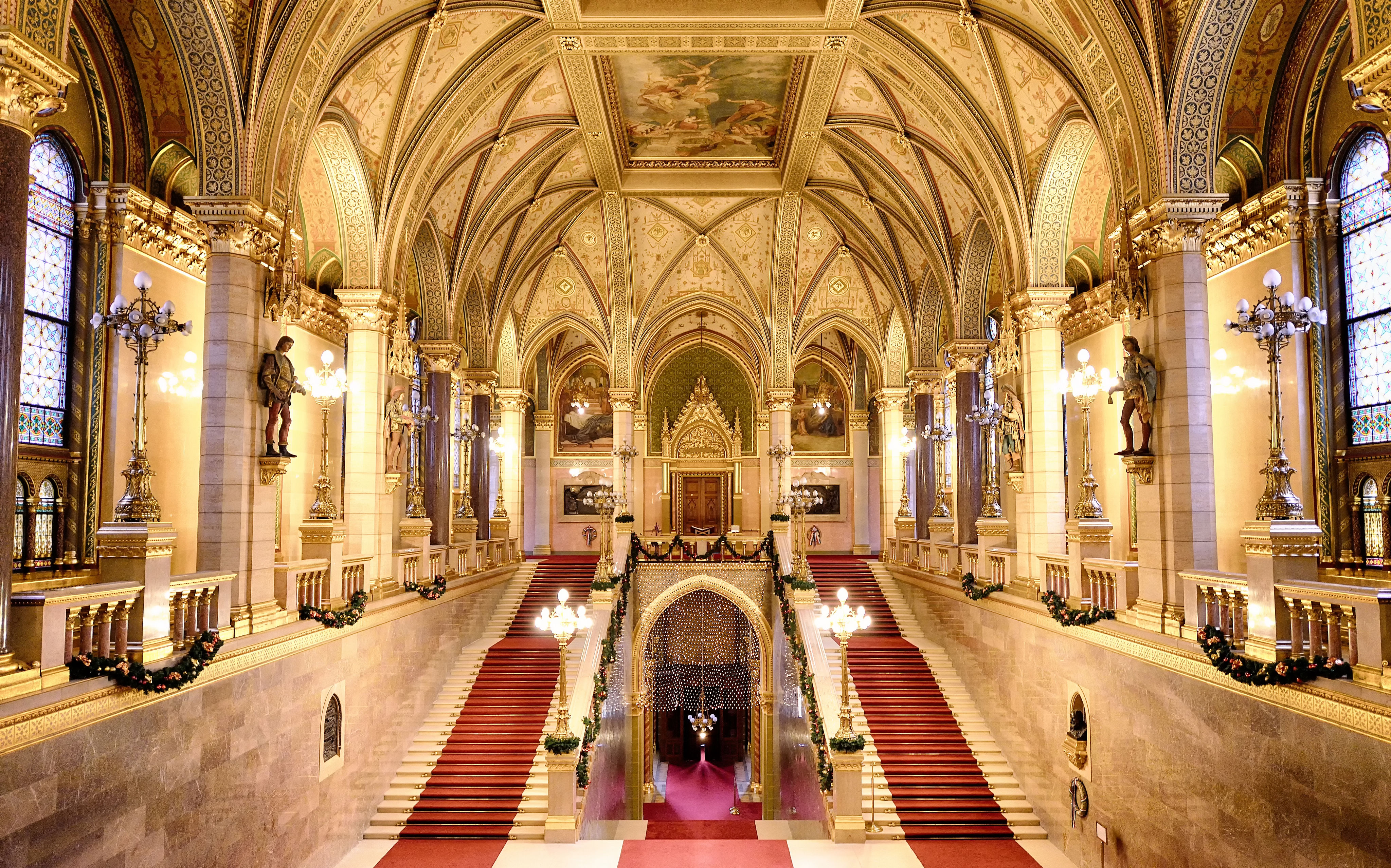 Ayrıca duvarlarda yer alan Macar kraliyet armaları, soylu ailelerin sembollerini ve tarihî sahneleri betimleyen tablolar, ulusal tarih anlatısını sürdürür.