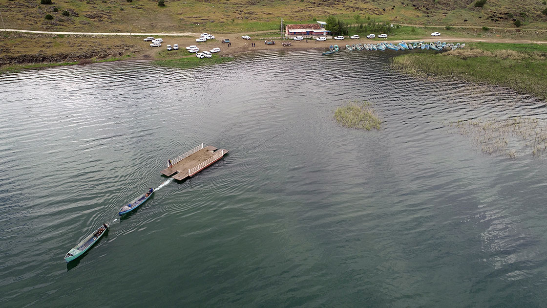 Adanın karayla fiziksel bağlantısı bulunmamaktadır. Ulaşım, geleneksel olarak motorlu tekneler veya 15 tonluk dubalar ile sağlanmaktadır. Yaz mevsiminde bu ulaşım araçları yoğun şekilde kullanılırken kış mevsiminde göl yüzeyi kısmen donabilmekte ve halk göl üzerinden yürüyerek ulaşımı sağlamaktadır.