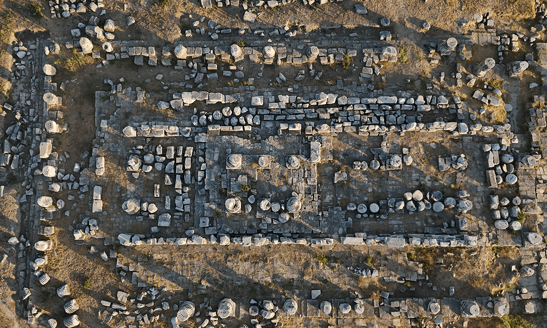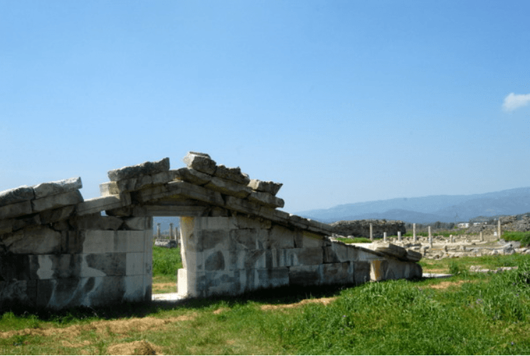 The Temple of Leukophryne, dedicated to Artemis, is the city’s most important religious building. Excavations between 1994 and 2001 in the Sanctuary of Artemis uncovered a ceremonial area paved with marble between the altar and the agora in front of the temple. This area is notable for its reliefs of deities reaching up to three meters in height and the sacrificial rings located in front of them. The locations for participants during rituals were marked with inscriptions called topos. Architectural remains of the stoa that once surrounded the sanctuary have also been unearthed.