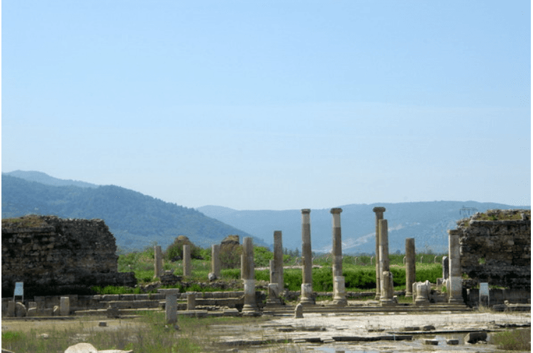 The city also includes the Theatron, constructed for religious ceremonies but left incomplete due to a landslide; a 32-seat Latrina (public toilet); a bath complex similar to the Faustina Baths in Miletus; an Odeon; a stadium-hippodrome with a capacity of 40,000; a Gymnasion for athletic training; a Roman temple; Byzantine walls; and the Çerkez Musa Mosque, which dates to the 5th century and has a transverse plan.