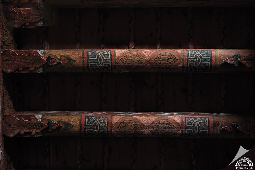 Mahmut Bey Camii’nin kalem işiyle süslenmiş özgün ahşap tavan detayları (Kültür Portalı)