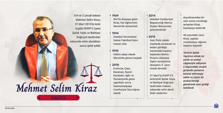 Cumhuriyet Savcısı Mehmet Selim Kiraz, 31 Mart 2015 tarihinde İstanbul Adalet Sarayı’nda görev yaptığı sırada silahlı bir saldırı sonucunda hayatını kaybetmiştir. Olay, yargı mensuplarının güvenliği ve adliye binalarındaki koruma önlemleri konularında kamuoyunda çeşitli tartışmalara yol açmıştır.