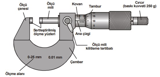 Mikrometre ve Bileşenleri (Kredi: Makine Teknolojisi, MEB, 2014.)