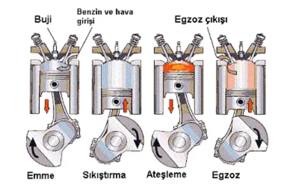 Bu çevrim, motor çalıştığı sürece yüksek hızda tekrarlanır. Pistonların krank miline ilettiği hareket sayesinde motorun mekanik enerjisi tekerleklere aktarılır.