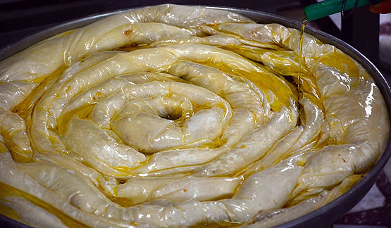 - Yağlama ve Pişirme: Üzerine bolca sadeyağ gezdirilir. Yağın emilmesi beklendikten sonra 215°C fırında pişirilir.