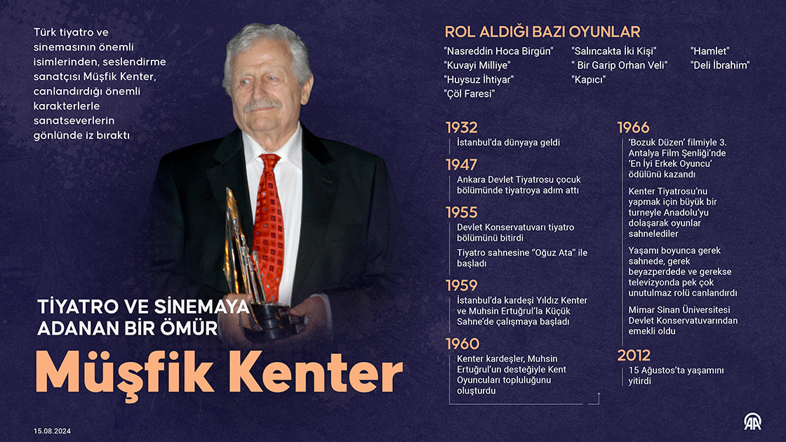 Müşfik Kenter (9 Eylül 1932 – 15 Ağustos 2012), Türk tiyatrosunun önde gelen oyuncularından biridir. Sahne, sinema, televizyon ve dublaj alanlarında çok yönlü bir kariyere sahip olan Kenter, tiyatro toplulukları kurmuş ve sahne yaşamını uzun yıllar sürdüren bir sanatçıdır.