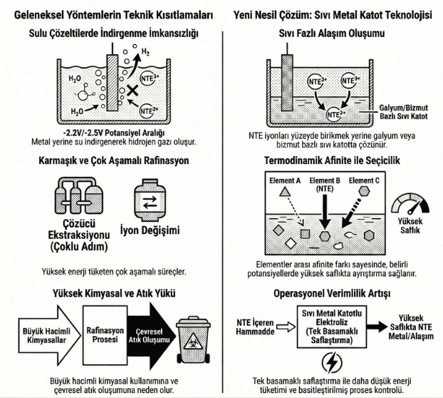 Geleneksel NTE ayrıştırma süreçleri çok aşamalı çözücü ekstraksiyonu, iyon değişimi ve kademeli saflaştırma adımlarına dayanır. Ancak bu yöntemler yüksek enerji tüketimi, karmaşık proses kontrolü ve büyük hacimli kimyasal kullanımına ihtiyaç duyar. Bu zorlukları azaltmak amacıyla son yıllarda “tek basamaklı saflaştırma” yaklaşımı üzerine yoğun araştırmalar yürütülmektedir. Bu bağlamda en dikkat çekici teknolojilerden biri, sıvı metal katotlu elektroliz sistemleridir.