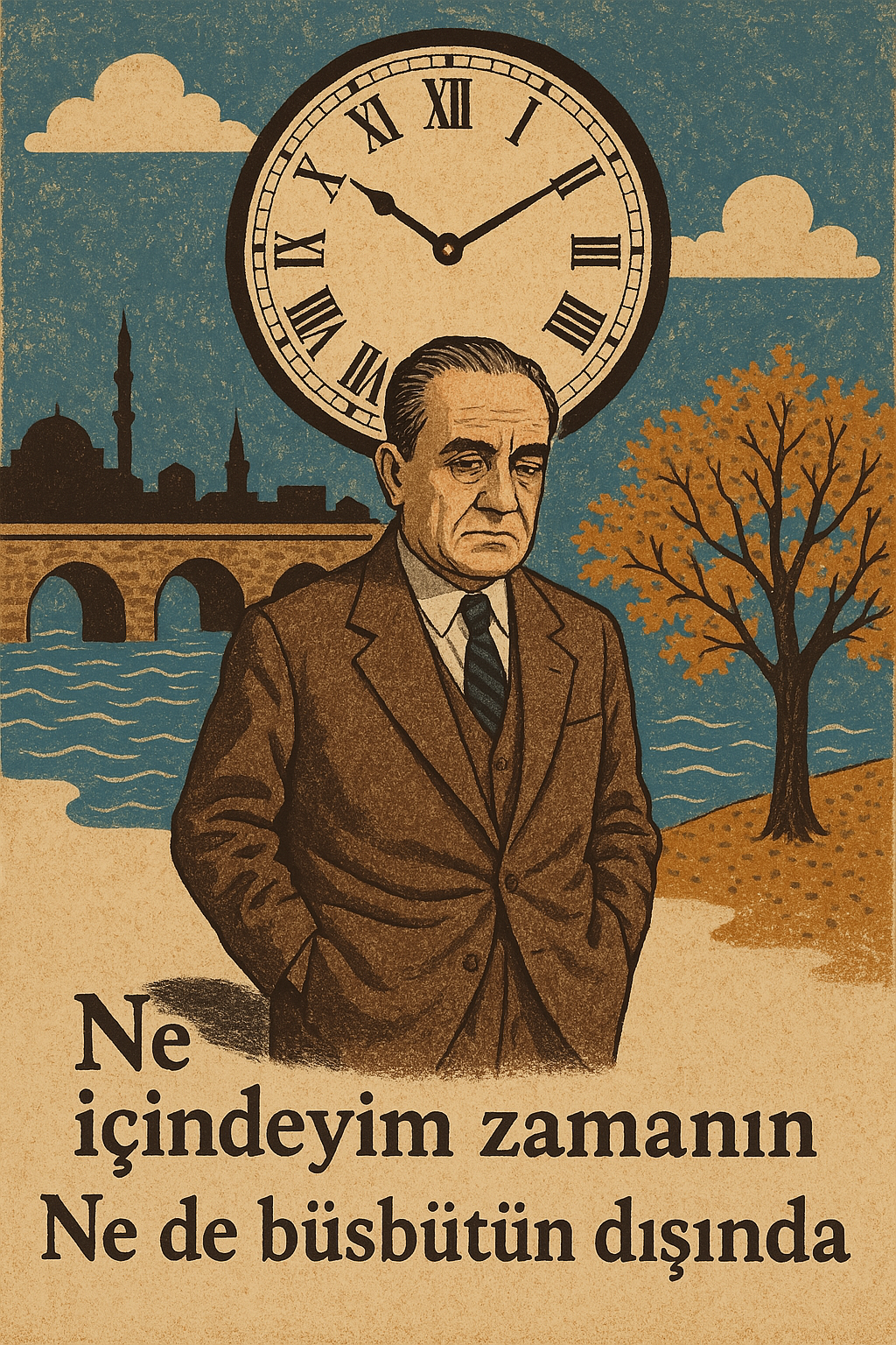 Ahmet Hamdi Tanpınar'ın “Ne içindeyim zamanın, / Ne de büsbütün dışında.” söylemi ile ilgili temsili görsel. (Yapay Zeka ile oluşturulmuştur.)