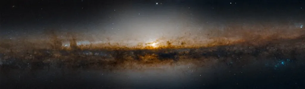 NGC 4565, belirgin bir merkezi çıkıntıya (bulge) ve karanlık bir toz bandına sahiptir. Toz bandı, gök adanın merkezi boyunca simetrik biçimde uzanmakta ve yıldız ışığını kısmen soğurarak gözlemi etkilemektedir. Bu yapı, yıldızlararası ortamın yoğunluğunu ve bileşimini anlamak açısından önemlidir. İnfrared gözlemler, bu tozun büyük oranda karbon bazlı bileşikler ve silikat taneleri içerdiğini göstermektedir.