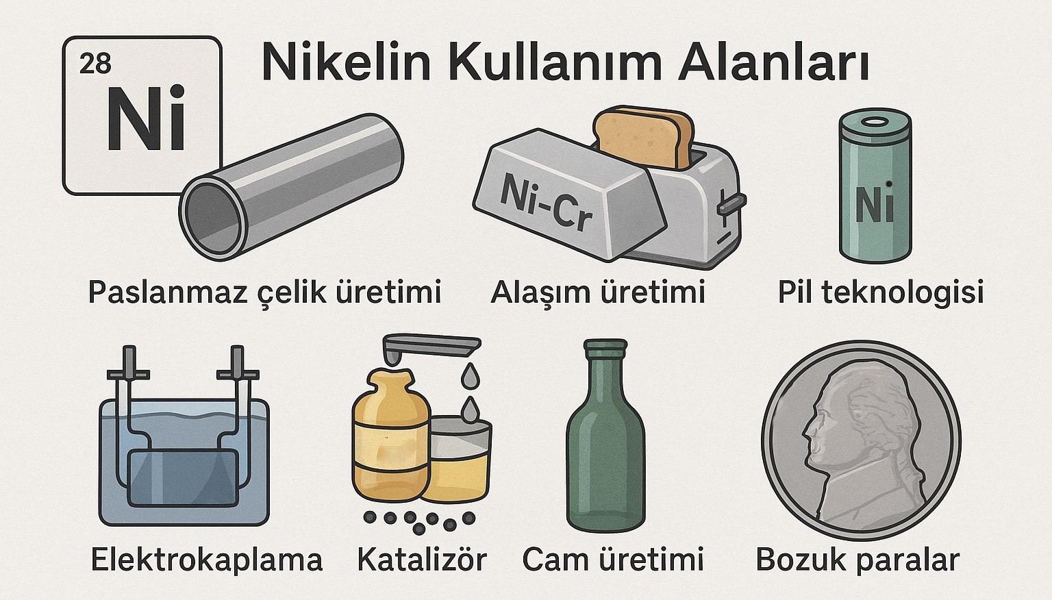 Nikel Elementinin Kullanım Alanları (Yapay zeka ile oluşturulmuştur.)