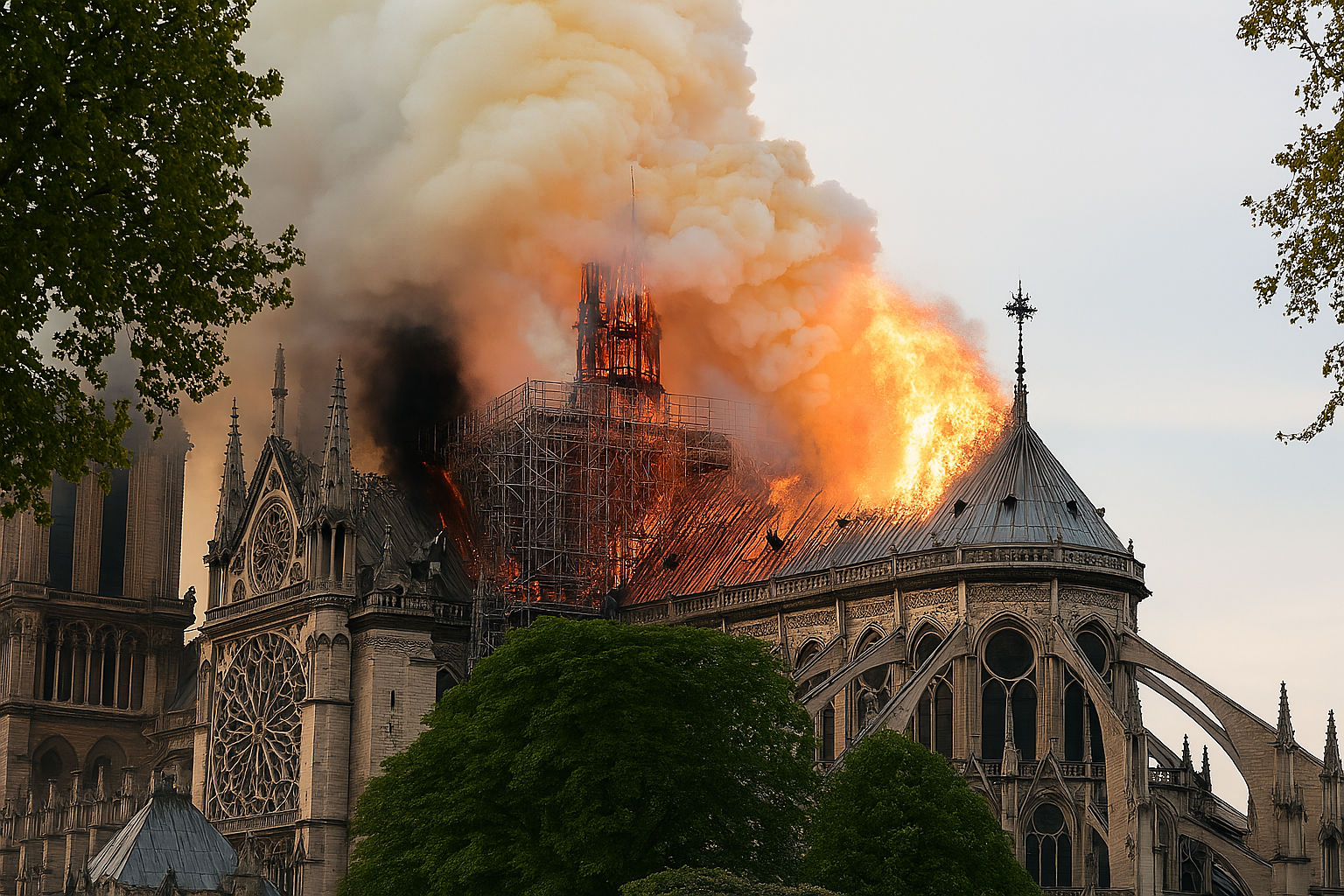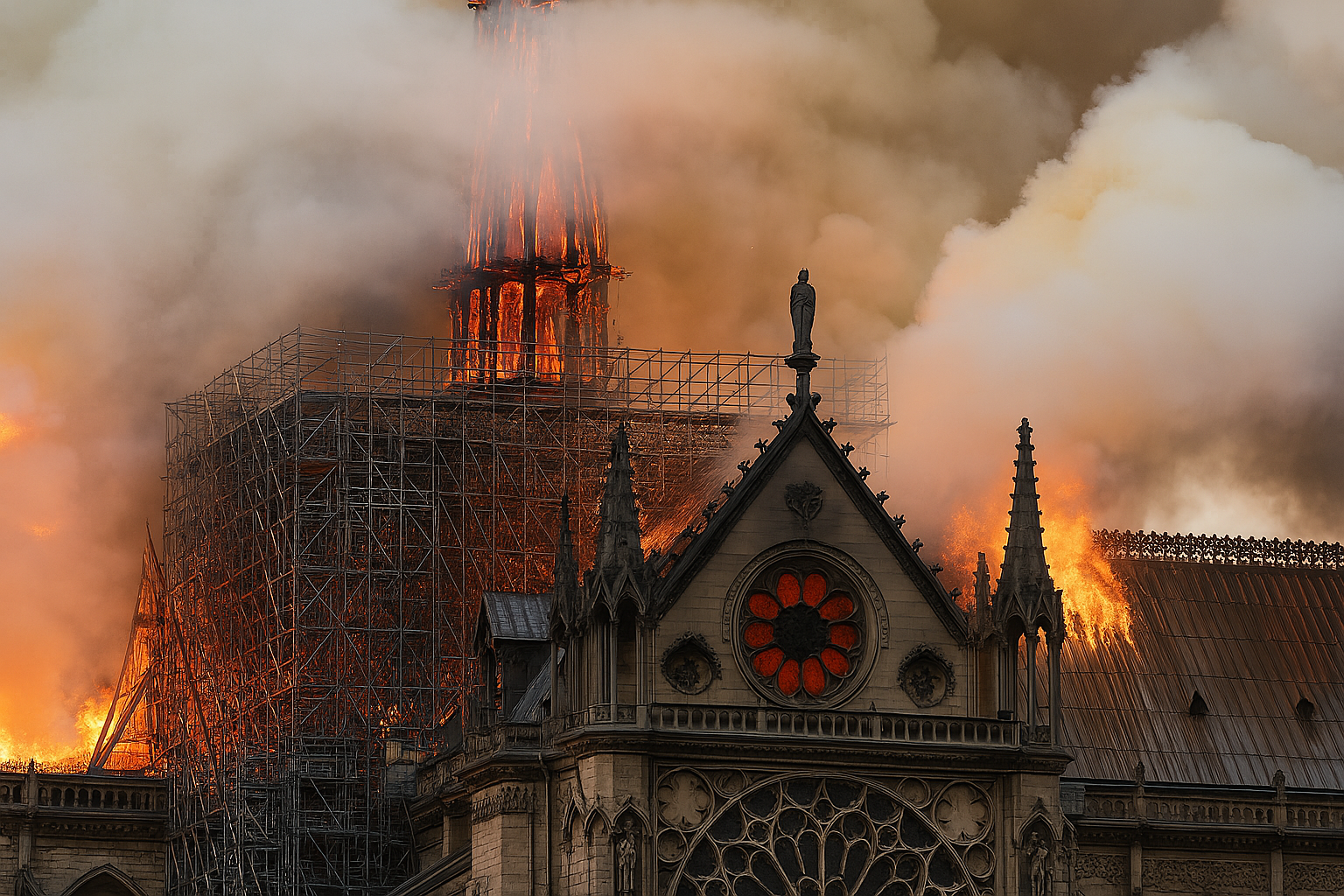 Notre- Dame Katedrali Yangın Anlarından Bir Kare. (Görselde yapay zeka desteği bulunmaktadır).