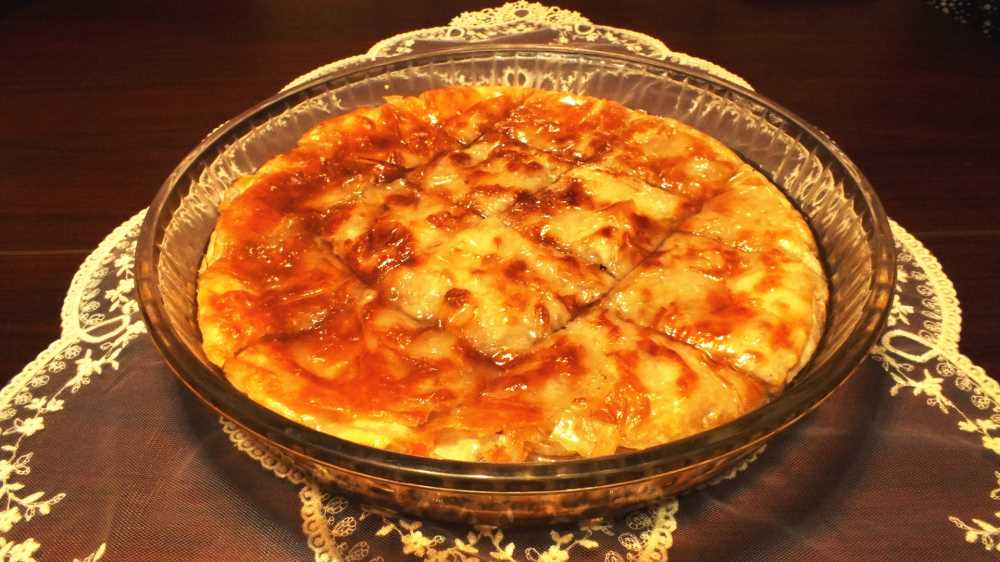 - Yufkaların tamamı dizilip fındık serpilince, alt kısım tavada nar gibi kızarana kadar pişirilir.