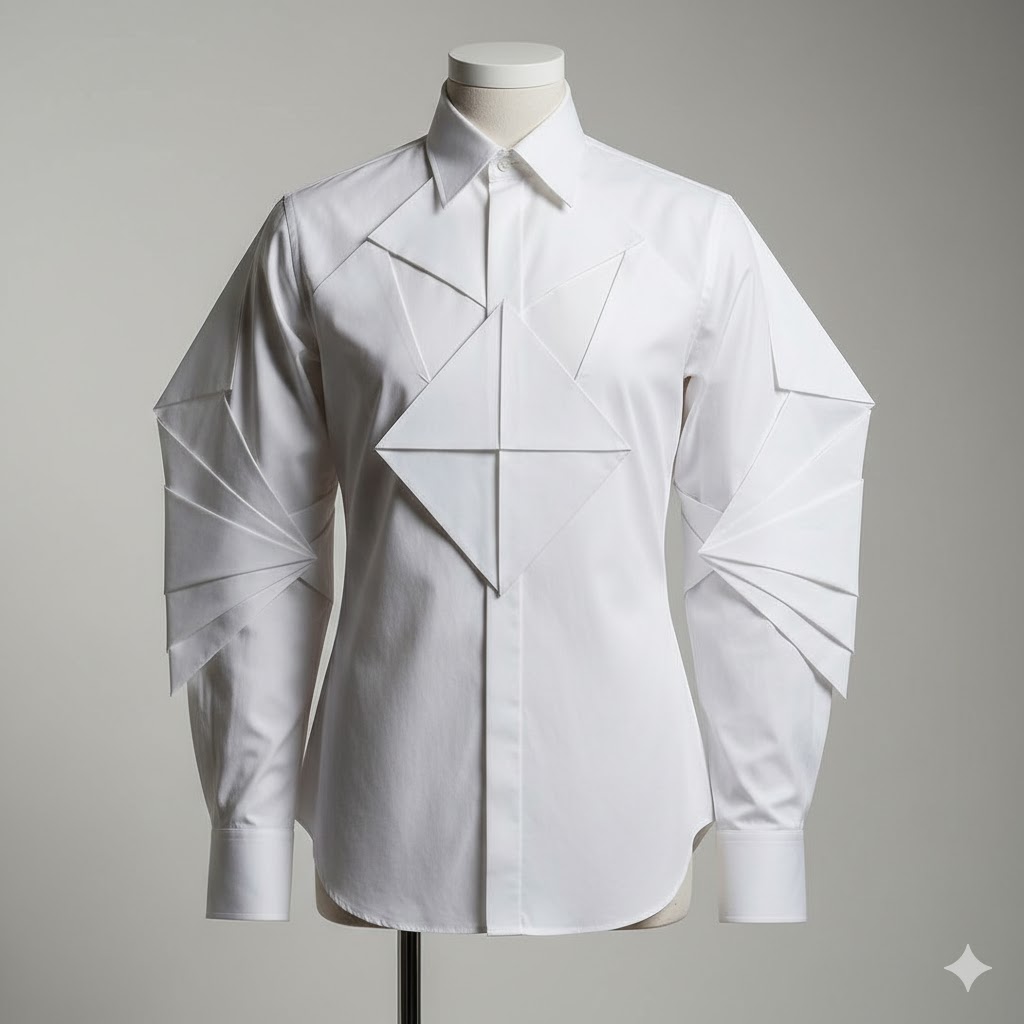 Origami Tekniğinden Esinlenerek Tasarlanmış Bir Gömlek (Yapay Zeka ile Oluşturulmuştur.)