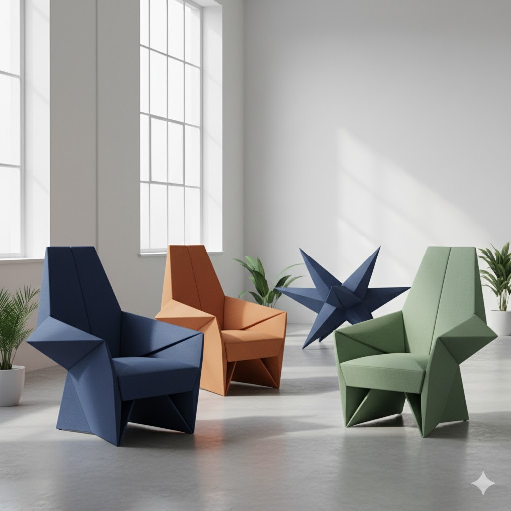 Origami Tekniğinden Esinlenerek Tasarlanmış Koltuklar (Yapay Zeka ile Oluşturulmuştur.)