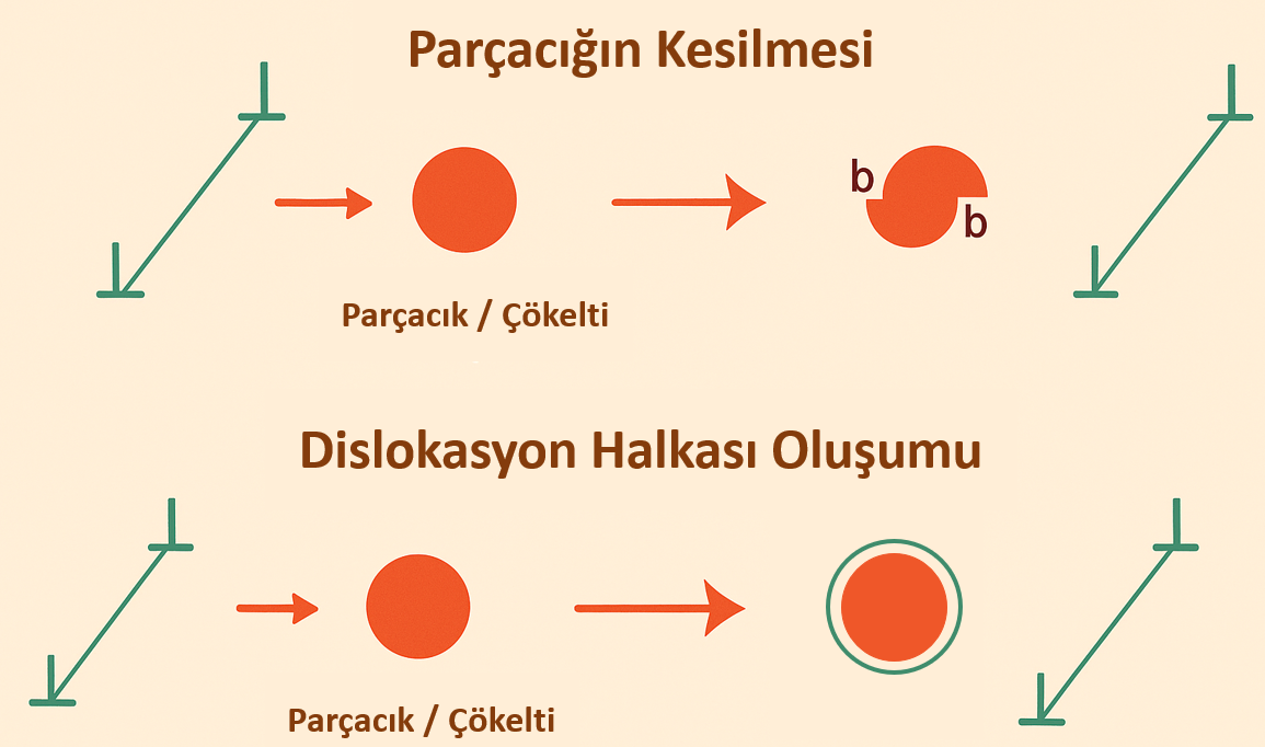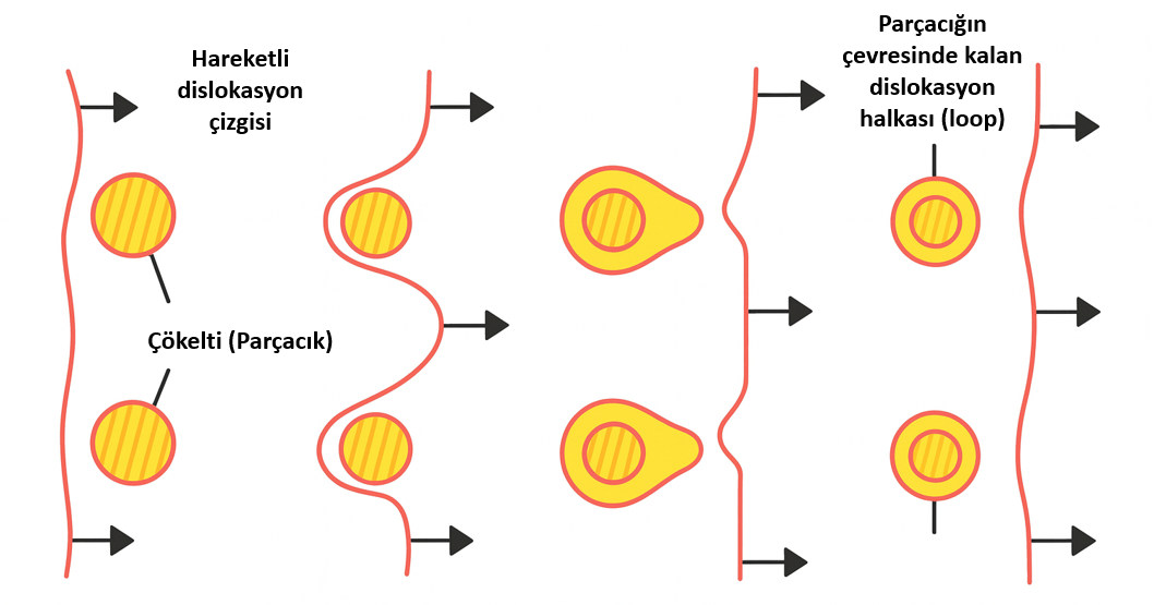 Bir dislokasyon, malzeme içerisinde bir çökelti veya sert bir ikincil faz parçacığı ile karşılaştığında iki farklı davranış sergileyebilir. Küçük ve matrisle bağdaşık (koherent) parçacıklar, dislokasyon tarafından kesilerek (içlerinden geçilerek) aşılabilir. Bu duruma literatürde Friedel mekanizması (parçacığın kesilmesi) adı verilir. Daha büyük veya bağdaşmaz (inkoherent) parçacıklar söz konusu olduğunda ise dislokasyon çizgisi, doğrudan parçacığın içinden geçemediği için onun etrafında eğilerek bir yay gibi hareket eder. Yeterli dış gerilim uygulandığında dislokasyon, parçacığın her iki yanından kavis çizip birleşerek yoluna devam eder. Bu süreç tamamlandığında parçacığın çevresinde kapalı bir dislokasyon halkası (loop) oluşur. Dislokasyonun bir engeli bu şekilde dolaşarak geride halka bırakmasına Orowan mekanizması denir. Bu olgu, özellikle çok sert veya büyük çökeltiler varlığında (örn. aşırı yaşlandırılmış alaşımlarda) gözlemlenir. Bağdaşık küçük parçacıklar çoğunlukla dislokasyonlarca kesilebilirken, bağdaşmaz veya kesilemeyecek kadar büyük parçacıklar Orowan tipi dolanma ile aşılır.