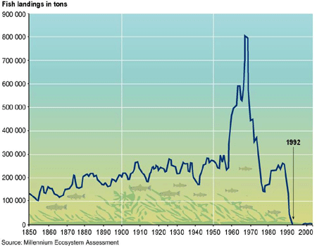 Tarihsel olarak, Kanada Newfoundland açıklarındaki Grands Banks, dünyanın en zengin balık avlama alanlarından biriydi. Teknolojik gelişmeler (örn: trol tekneleri) ve sıkı avlanma limitlerinin olmayışı aşırı kullanımına yol açtı. Bunun sonucunda Morina balıkçılığı 1990'ların başında çöküş yaşadı. Ayrıca bu durum geçim kaynaklarının tahrip olmasına, çevresel mültecilerinin akınına ve Kuzeybatı Atlantik ekosistemi üzerinde uzun vadeli etkilere yol açtı.