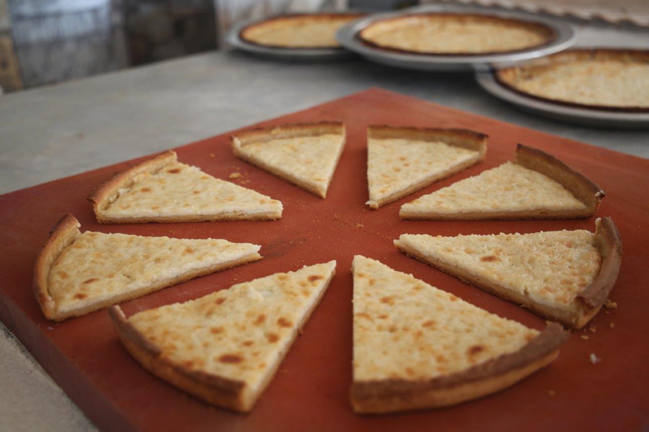 Dinlenen hamur tek kat olacak şekilde elle açılır ve yağlanmış bir yuvarlak tepsiye yayılır. Hamur, ortası çukur kalacak ve kenarları hafifçe yüksek olacak şekilde tepsiye yerleştirilir. Hazırlanan iç harç, hamurun ortasına dökülür ve tepsiye eşit şekilde yayılır. Üzerine isteğe bağlı olarak 20 g kadar susam ve çörek otu serpilir.