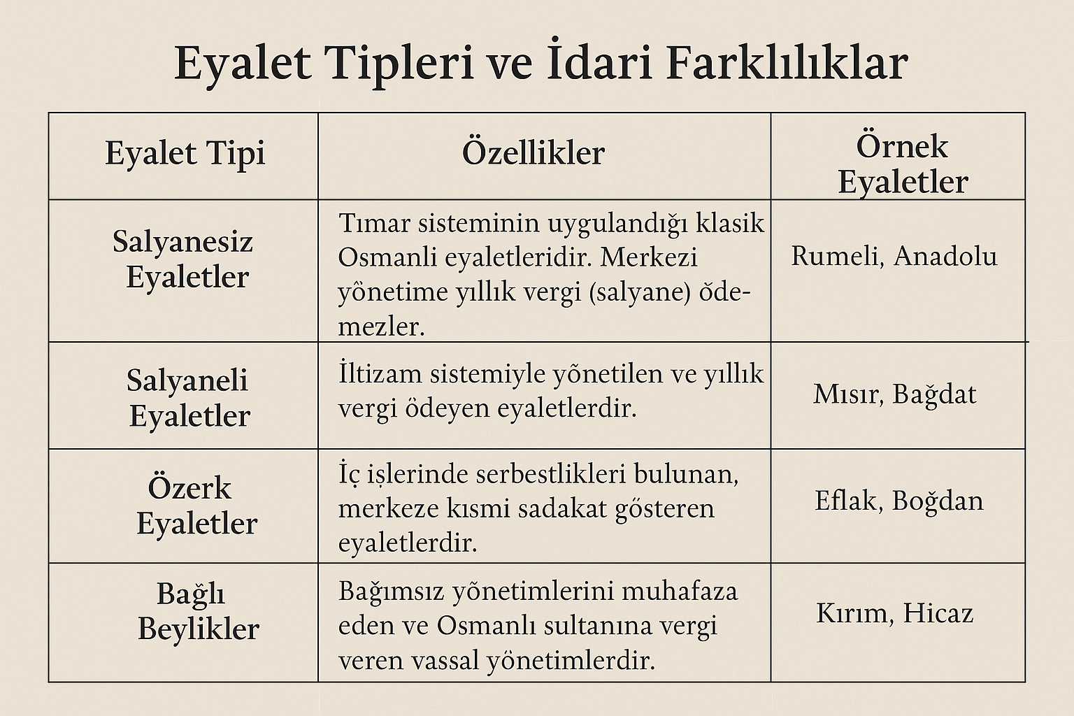 Osmanlı Eyalet Tipleri ve İdari Farklılıklarının Şematik Gösterimi (Yapay Zekâ ile Oluşturulmuştur)