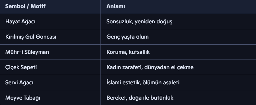 Mezar taşlarındaki süsleme unsurları yalnızca görsel estetik sunmakla kalmaz; aynı zamanda kişinin yaşamı, ölümü ve inanç sistemi hakkında ipuçları verir. Sık karşılaşılan semboller ve anlamları şöyle sınıflandırılabilir: