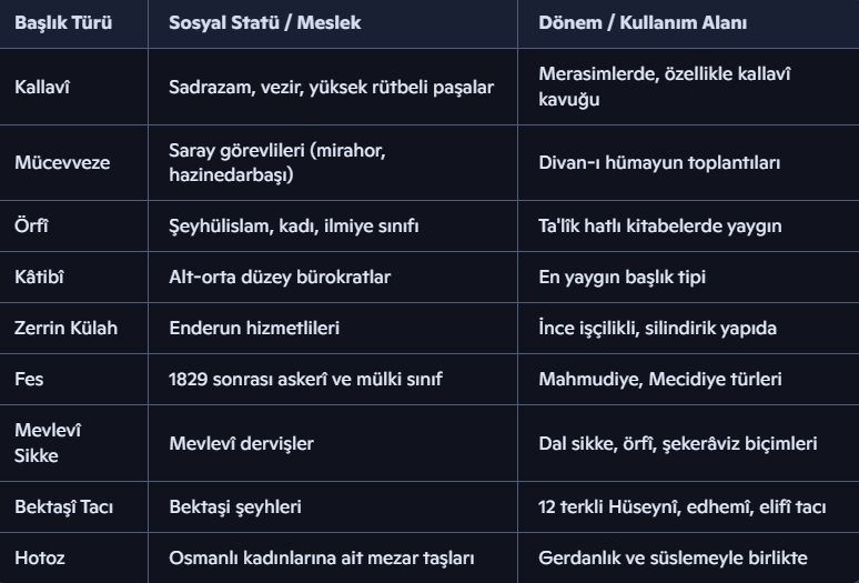 Osmanlı mezar taşlarının en ayırt edici unsurlarından biri, üst kısımda yer alan taş başlıklardır. Bu başlıklar, kişinin sağlığında giydiği kavuğun veya tarikat sikkesinin taştan yontulmuş bir izdüşümüdür ve toplumsal statüye dair görsel bir şifreleme sunar. Aşağıdaki tablo, başlık türleri ve temsil ettikleri sosyal katmanları göstermektedir: