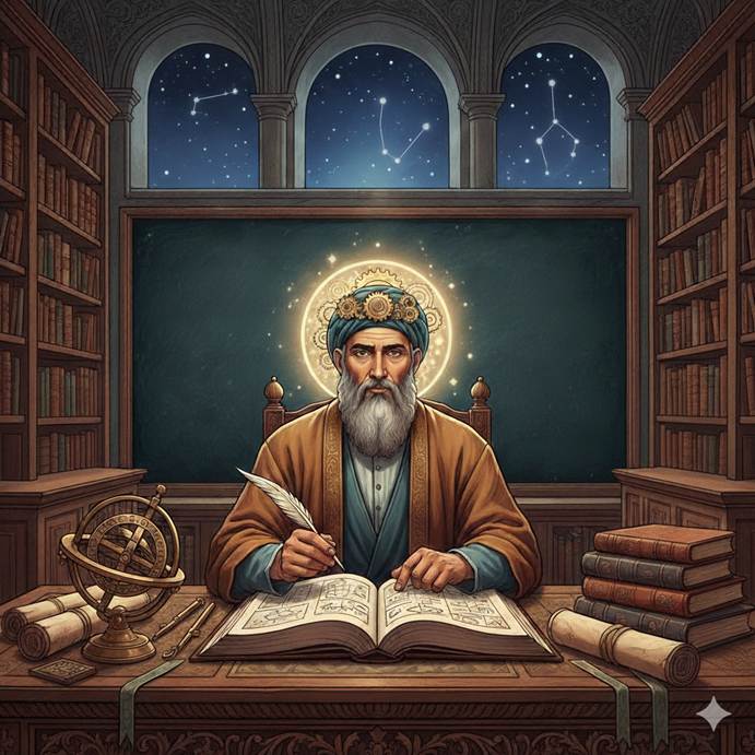 Mantık ilmiyle ilgilenen bir düşünür tasviri. (Görsel yapay zekâ ile oluşturulmuştur.)