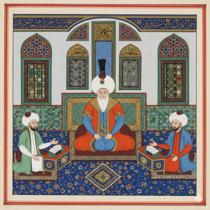 Osmanlı'da felsefe alanında tartışan düşünürlerin tasviri. (Görsel yapay zekâ ile oluşturulmuştur.)