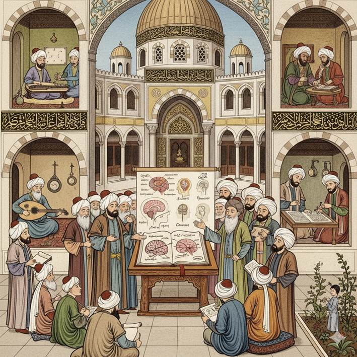 Osmanlı'da ruh sağlığı alanında yapılan çalışmalar ve tedavi görenlerin tasviri. (Görsel yapay zekâ ile oluşturulmuştur.)