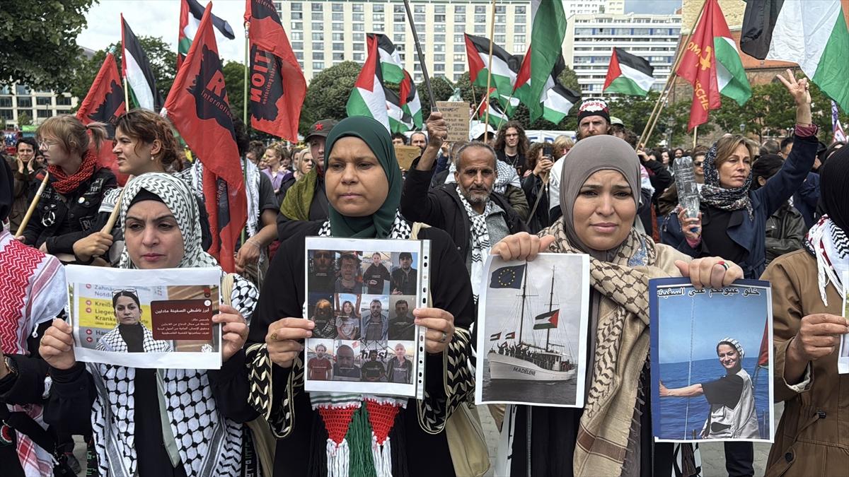 İsrail'in Gazze’ye yardım götüren "Madleen" gemisine saldırısı protesto etmek için Berlin'de düzenlenen gösteriler, 9 Haziran 2025 - (Anadolu Ajansı)