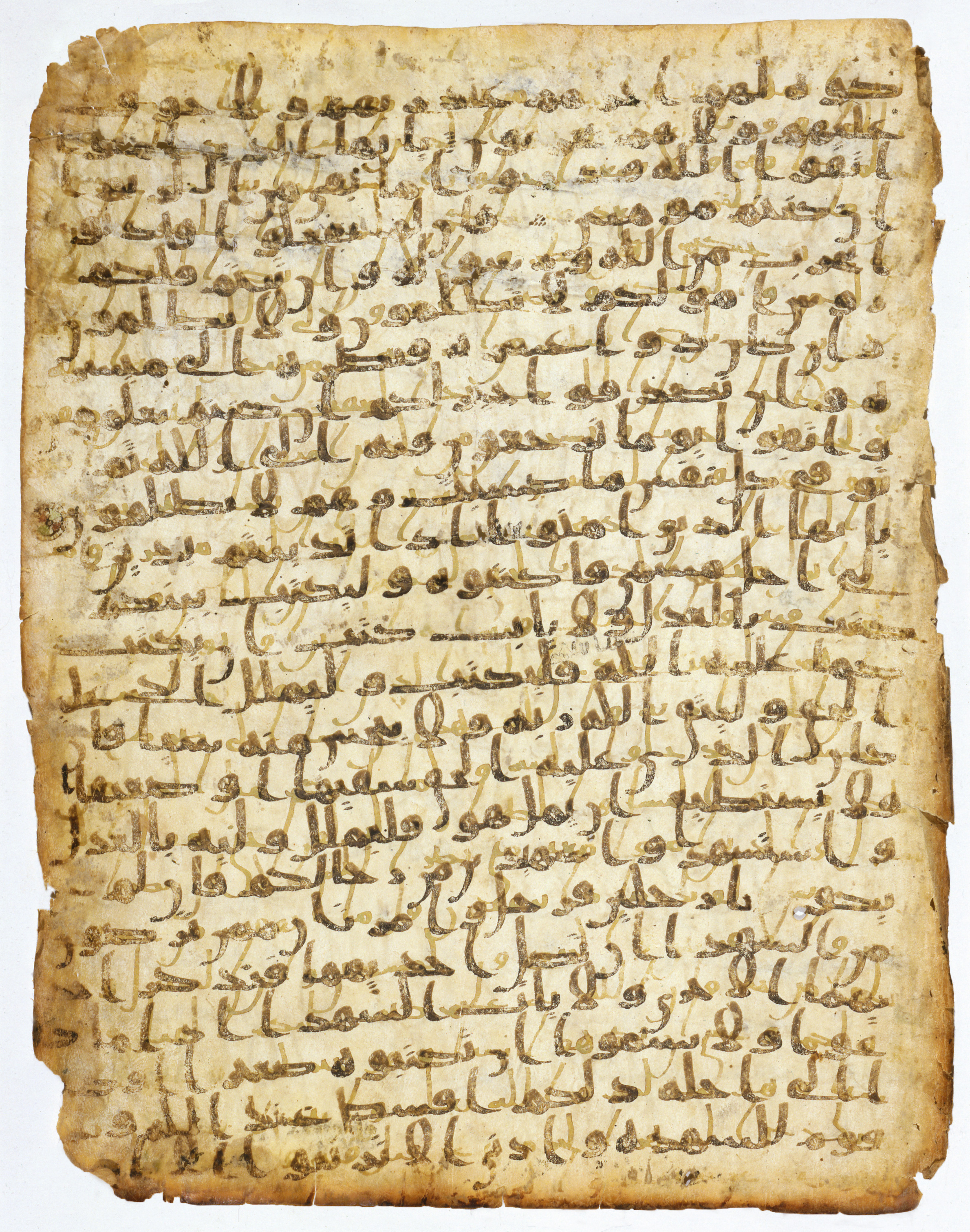 (Elimize ulaşan en eski Kur'an kopyalarından birinin parçası palimpsest bir parşömen. Altta ve üstte bulunan iki yazı Bakara Suresine aittir.)