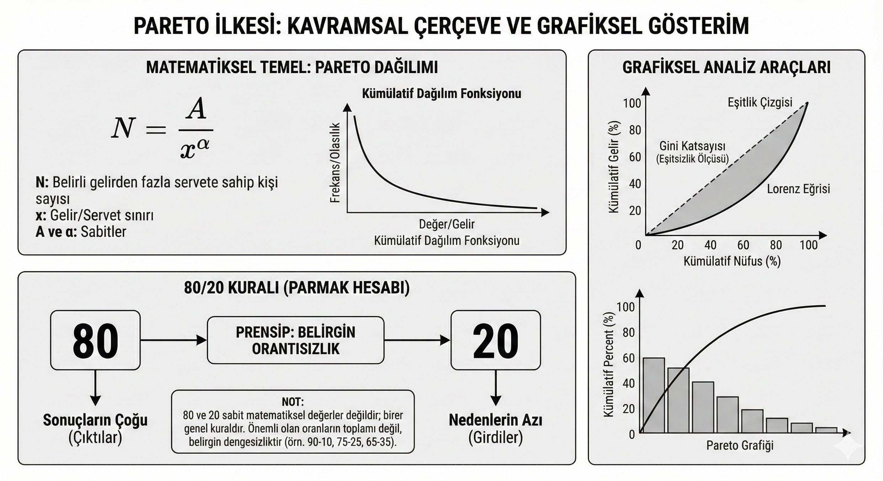 Pareto İlkesi'nin Matematiksel Temeli, Grafiksel Analiz Araçları Ve Kavramsal Çerçevesini Özetleyen İnfografik (Yapay Zeka İle Oluşturulmuştur)