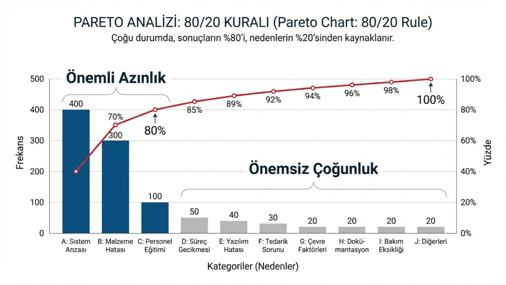 Pareto İlkesi'nin Temel Mantığını Yansıtan Sıklık Ve Yüzde Dağılım Grafiği (Yapay Zeka İle Oluşturulmuştur)