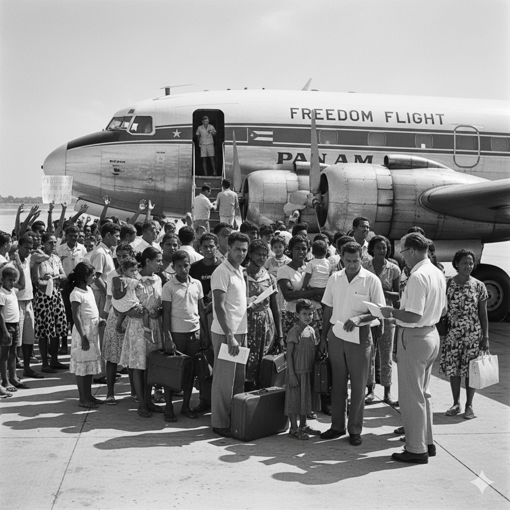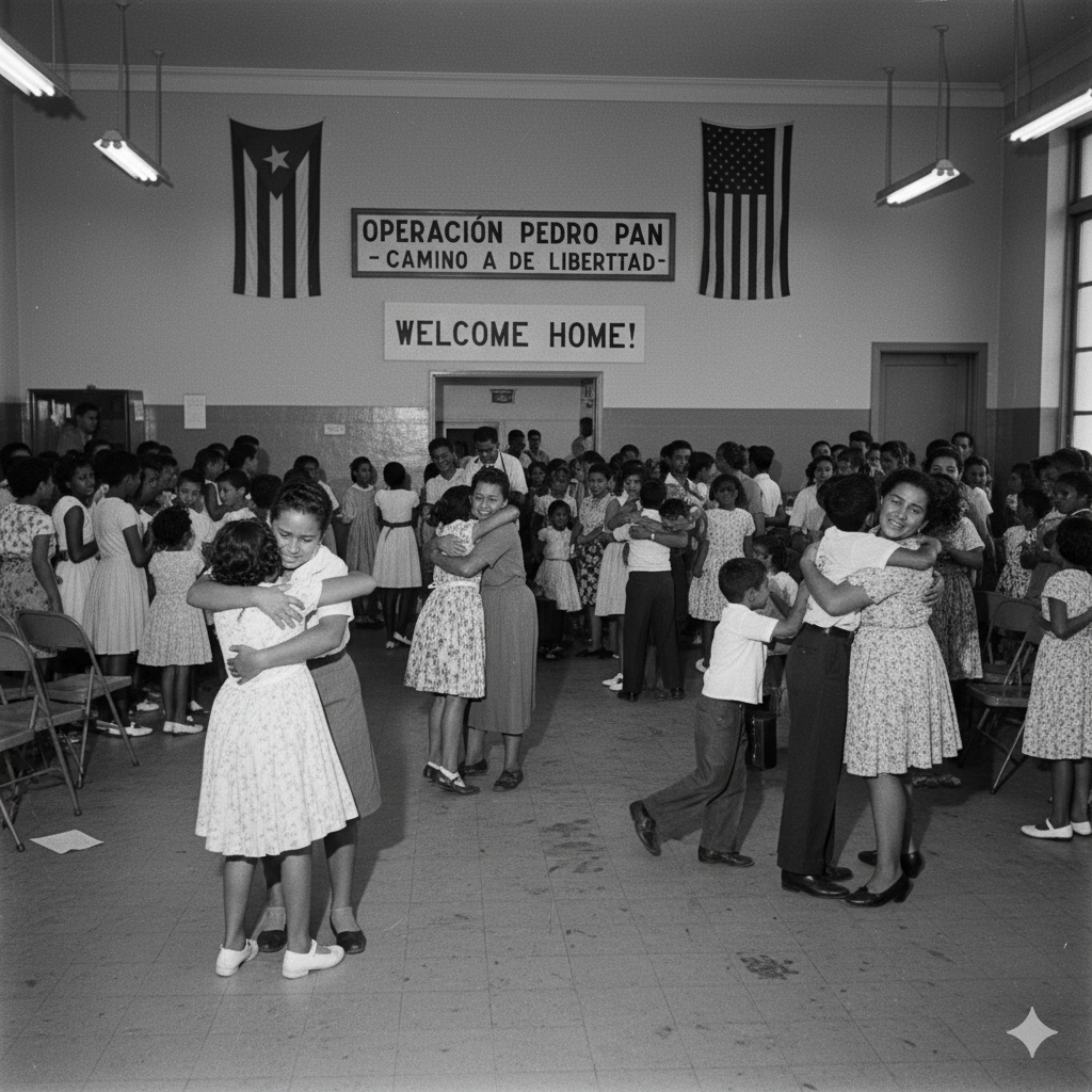 Pedro Pan Operasyonu Sonucu Göçmen Çocukların Ailelere Teslim Edilme Anı (Yapay Zeka ile Oluşturulmuştur)