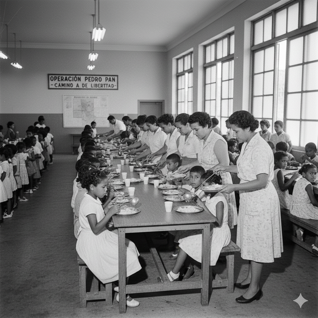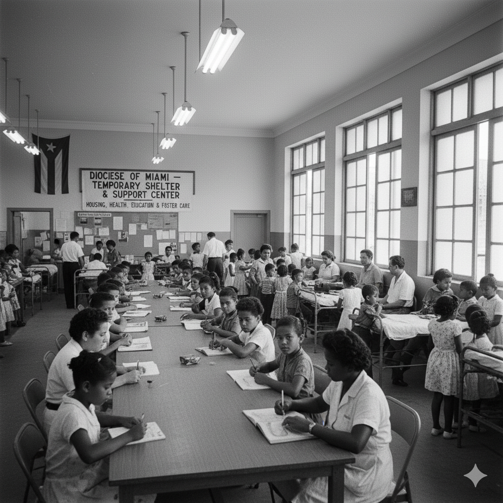 Pedro Pan Operasyonu'nda ABD Tarafında Miami Piskoposluğu'nun Geçici Konaklama Merkezi (Yapay Zeka ile Oluşturulmuştur)