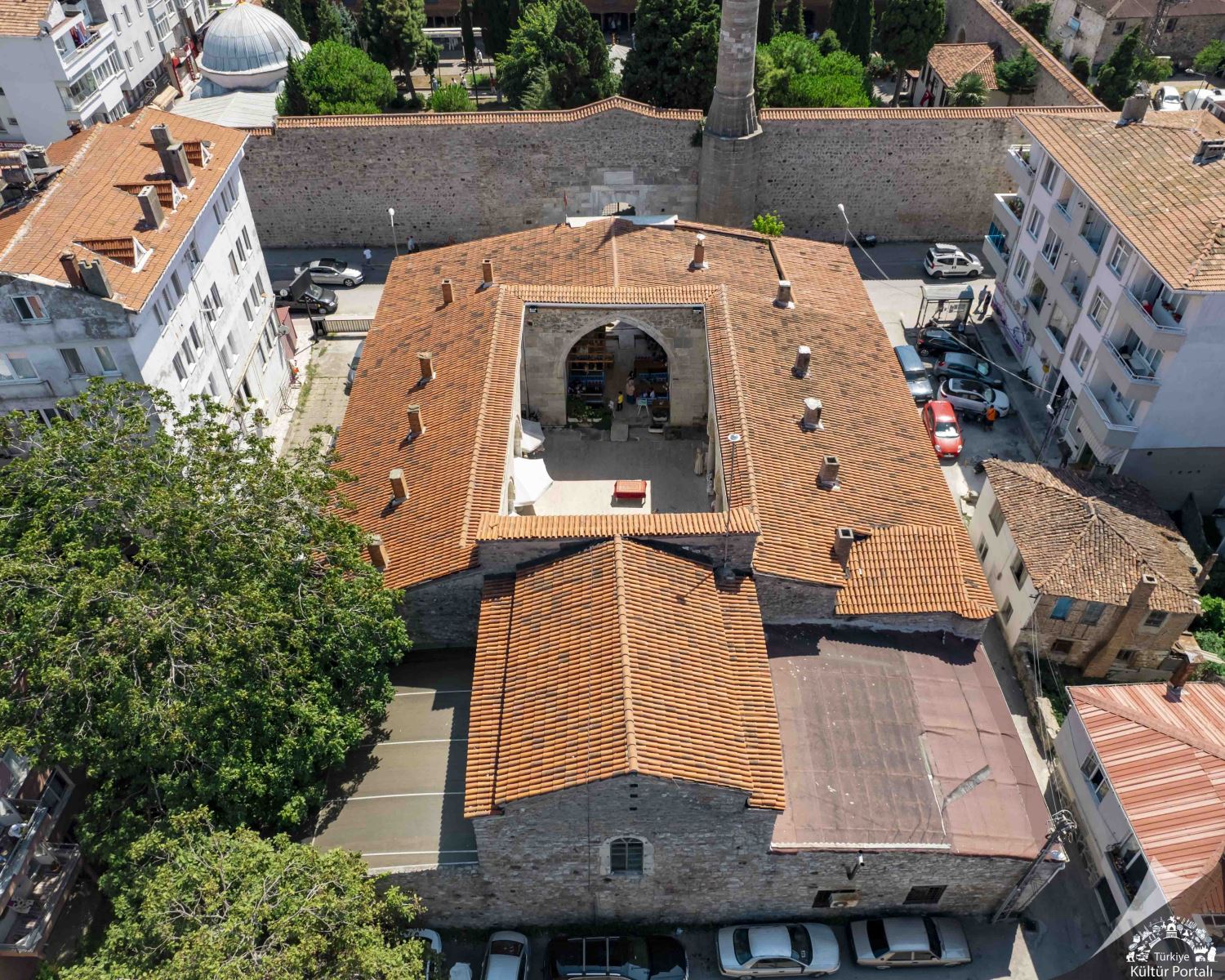 Avlunun ortasında sekizgen bir platform üzerine yerleştirilmiş sekizgen bir havuz yer alır. Platformun köşelerinde şadırvana ait olduğu düşünülen kare kesitli sütun kaideleri mevcuttur. Revaklar, üçer sütunlu kemerlerle avluya açılmakta olup, bu sütunların bir kısmı antik yapılardan devşirilmiştir. Revakların arkasında on bir adet oda yer alır. Bu odaların içinde ocak ve büyük pencereler bulunmaktadır. Tonozla örtülü olan odaların bir kısmı doğu–batı, bir kısmı ise kuzey–güney doğrultusunda yerleştirilmiştir.