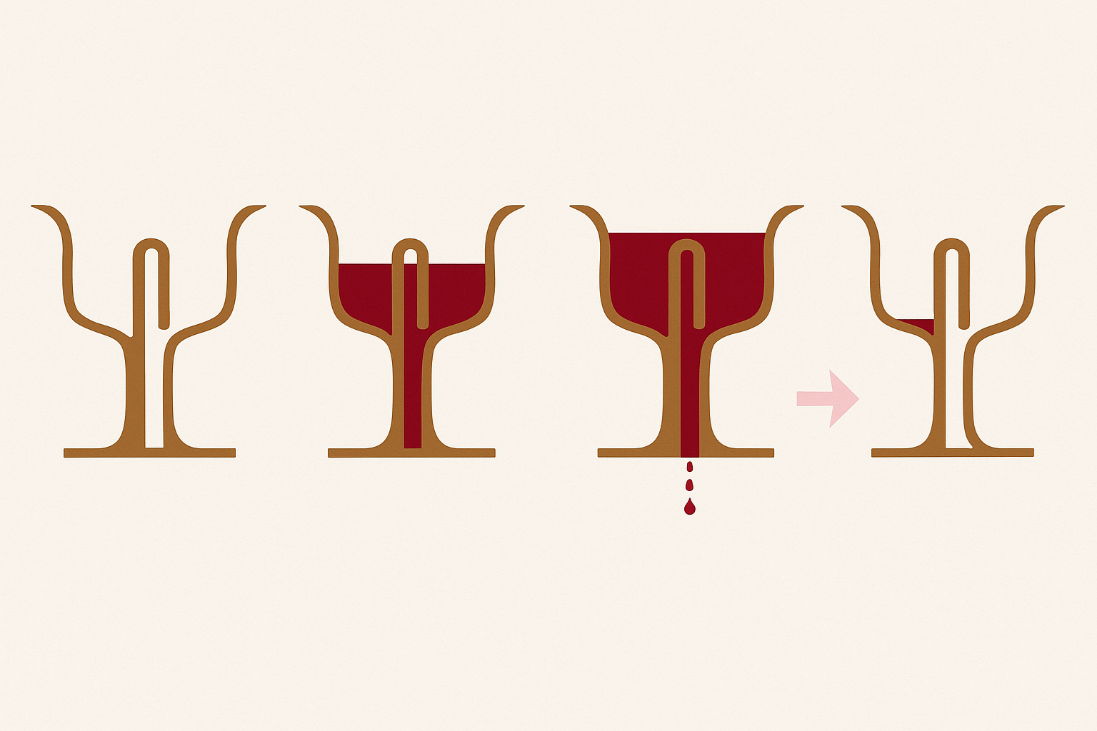 Bu noktada kupanın içindeki sıvı, tabandaki çıkış yolundan dışarı akmaya başlar ve tamamı boşalır. Sıvı seviyesi bu kritik noktayı geçmezse kupa normal şekilde kullanılabilir.