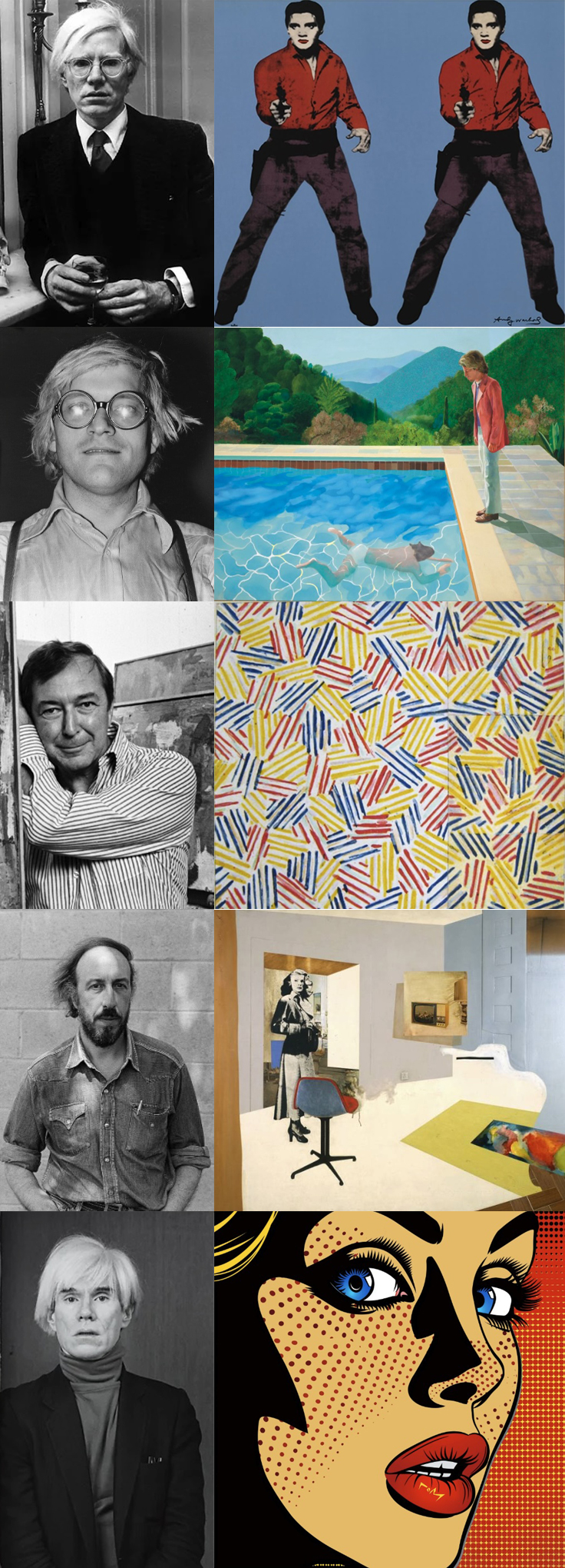 Sırasıyla; Andy Warhol, David Hockney, Jasper Johns, Richard Hamilton, Roy Lichtenstein ve Eserleri