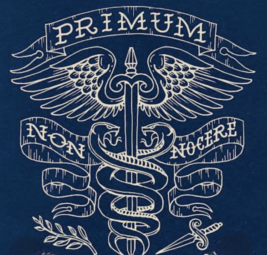 Tıp sembolü olan Kadüsenin üstüne yazılı Primum Non Nocere sözü (The New Yorker)