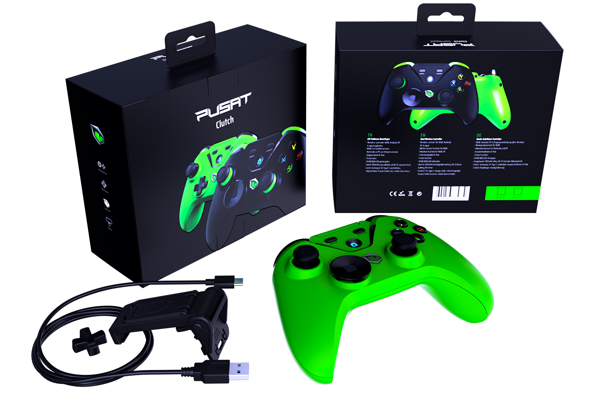 Pusat Clutch Gamepad yeşil renkte olup üzerinde RGB LED ışıklarla donatılmış XYAB tuşlarına sahiptir. Gövdesi, nano alıcıyı depolamak üzere özel bir tasarıma sahiptir. Ergonomik olarak klasik oyun kumandası yapısını andırır ve analog çubuk, omuz tetikleri ile birlikte iki başlığa sahip değiştirilebilir bir D-Pad içerir. Model, kullanım senaryolarına göre farklı D-Pad başlıklarıyla özelleştirilebilir.