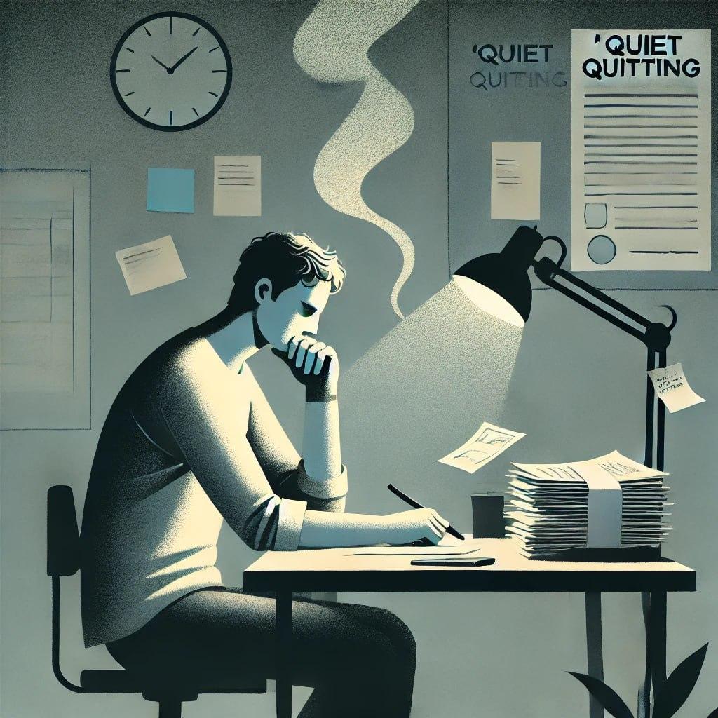 Quiet quitting refers to the situation where employees continue working but emotionally and mentally detach from their jobs. Although these employees are physically present at the workplace, they only exert enough effort to fulfill their basic responsibilities. They don't take on extra tasks, work overtime, and generally do not feel an emotional connection to their work. Quiet quitting does not mean quitting the job; rather, employees stick to doing the minimum required without putting in any extra effort.