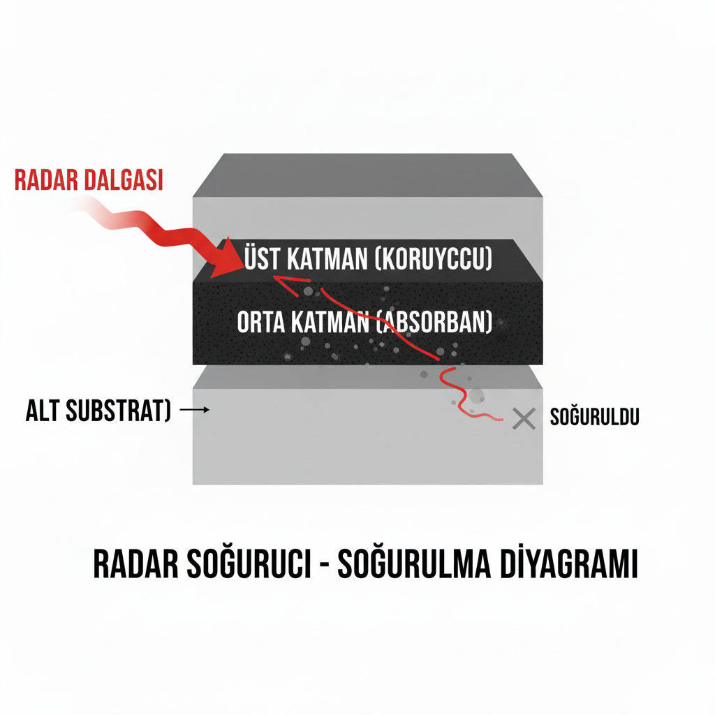 Düşünün ki el fenerinizi karanlıkta bir duvara tutuyorsunuz. Normalde ışık geri yansır ve gözünüz duvarı net görür. Ama eğer duvar ışığı içine çekerse, siz neredeyse hiçbir şey göremezsiniz. İşte radar soğurucu boyanın yaptığı da tam olarak bu: Radardan gelen dalgayı içine çekip, geri yansımasını engellemek.