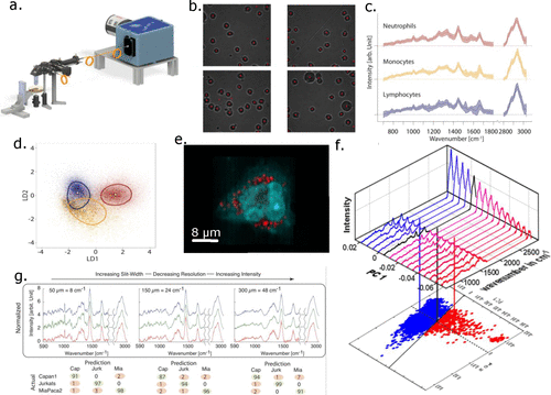 Raman spektroskopisi tek hücre analizi için bol miktarda olasılık sunar. Kısa sürede binlerce hücrenin edinilmesine olanak tanıyan yüksek verimli ekranlı Raman spektroskopisi sistemi (a).Hücreler parlak alan görüntüsünde otomatik olarak tanınır ve insan müdahalesi olmadan ölçülür (b).HTS-RS sisteminde edinilen üç farklı tip için binlerce lökositten alınan ortalama Raman spektrumları (c). Çok değişkenli istatistiksel analiz, bu hücrelerin moleküler imzalara göre kolayca ayrıldığını gösterir (d). Raman görüntüleri, farklı makromoleküllerin hücre içi dağılımının görselleştirilmesini sağlar (e).Raman tabanlı bir canlılık testi, canlı ve cansız hücreleri kolayca ayırt edebilir (f).Üç farklı hücre tipinin karakterizasyonu için düşük çözünürlüklü Raman spektroskopisinden alınan örnekler, azaltılmış spektral çözünürlükle bile hücrelerin ayırt edilebileceğini ve düşük maliyetli yüksek verimli sistemlerin uygulanmasına olanak sağladığını göstermektedir (g).(3)