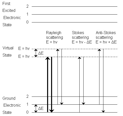 E = hν enerjili bir foton tarafından uyarılan bir molekülün üç tip saçılması. En yaygın geçiş kalın oklarla işaretlenmiştir.(1)