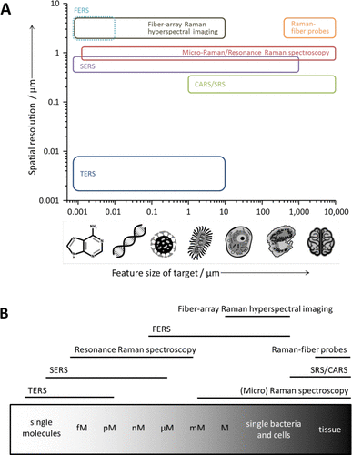 (A) Çeşitli Raman tabanlı teknikler için hedefin mekansal çözünürlüğünün ve özellik boyutunun gösterimi. (B) Çeşitli Raman tabanlı yöntemlerin hassasiyet ölçeği.(2)